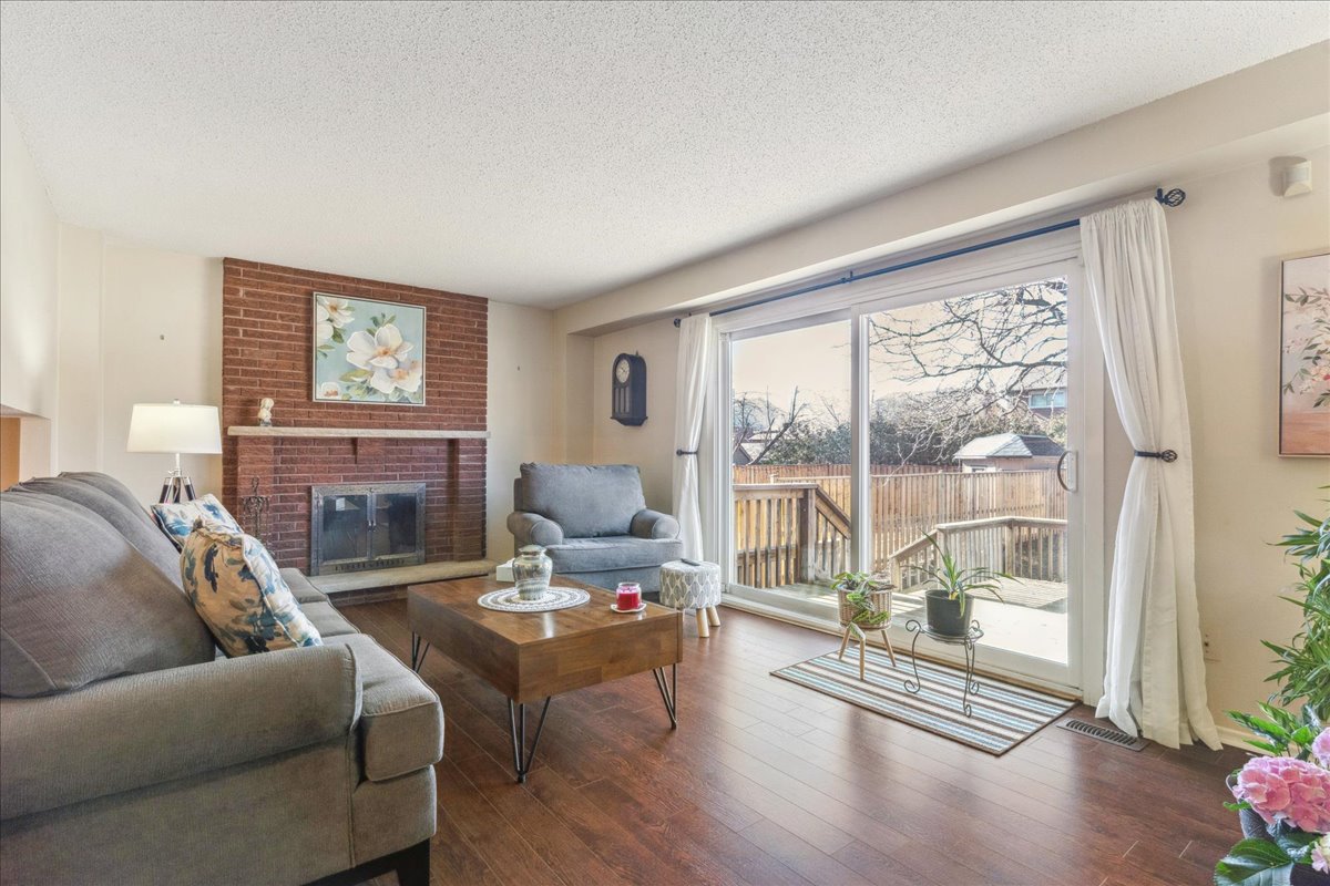 Living Room W/New Laminate Floors, Brick Fireplace. Double Door Patio W/O To Large Deck W/Roll Out